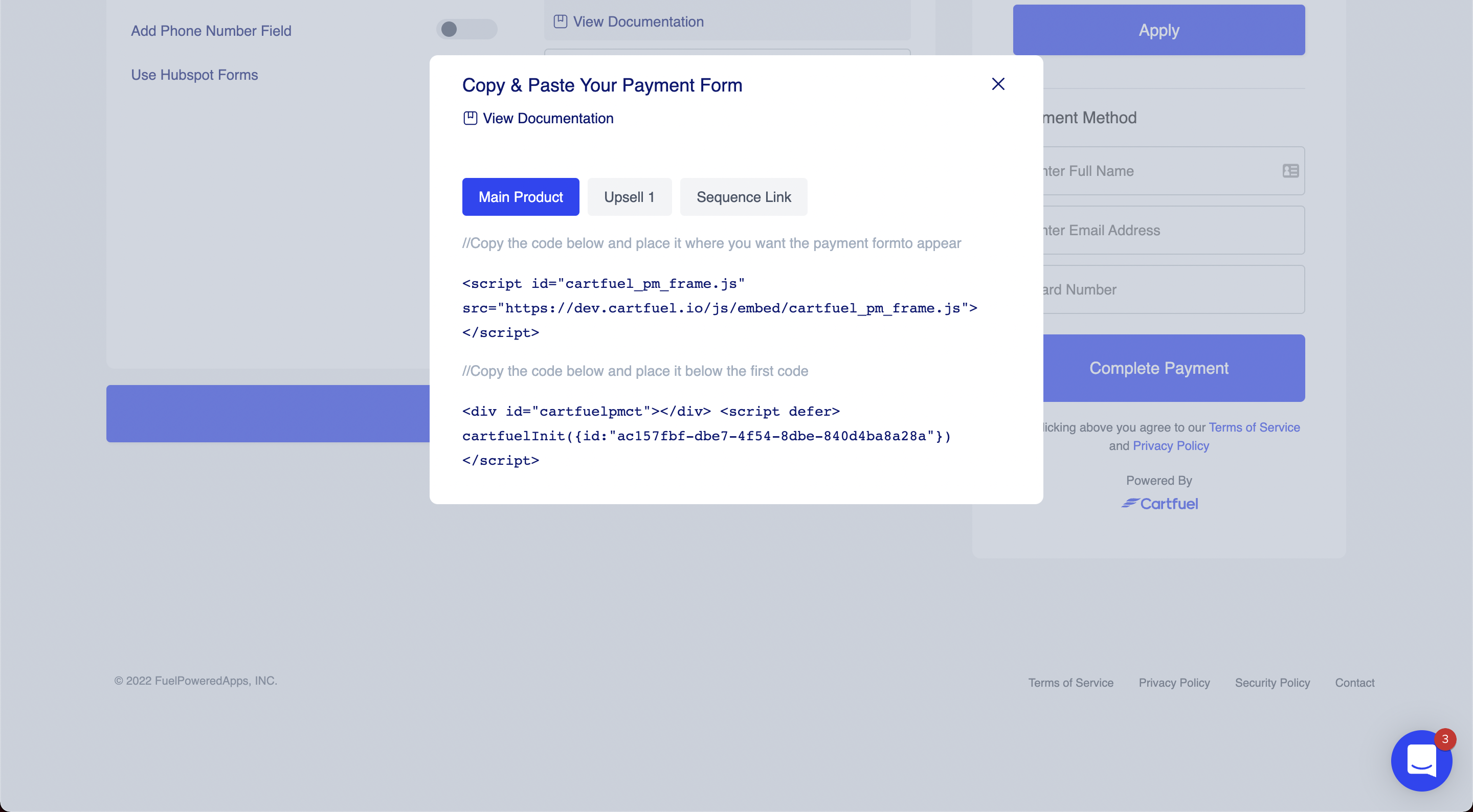 All you need to embed your new payment form is the code snippet Cartfuel provides you.